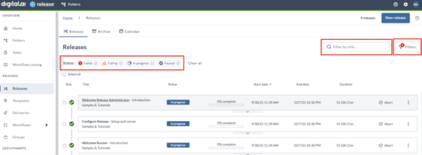 - Release list & calendar: more sorting options, lists of applied filters (title, owner, tags ALL/ANY, status, risk), and folder-level calendar views.