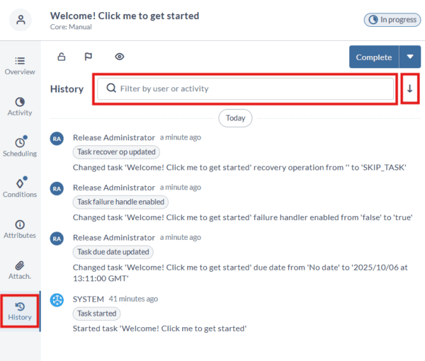 - Task Drawer history: filter by user/type, sort by time, investigate without leaving the task.